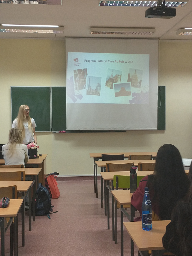 W dniu 14 listopada uczniowie naszej szkoły z klas: IIID, IVB, IVC i IVE1 uczestniczyli w spotkaniu z ambasadorką programu Au Pair, która przybliżyła młodzieży ideę międzynarodowej wymiany kulturowej oraz możliwości, jakie daje wyjazd jako Au Pair. Podczas spotkania uczniowie dowiedzieli się, jak wygląda codzienna praca Au Pair, jakie są wymagania i korzyści uczestnictwa w programie, a także mieli okazję zadać pytania dotyczące życia w rodzinie goszczącej, nauki języka i poznawania nowych kultur. Prelegentka podzieliła się również własnymi doświadczeniami z pobytu za granicą, zachęcając młodzież do rozwijania kompetencji językowych i zdobywania nowych umiejętności. Spotkanie cieszyło się dużym zainteresowaniem i stanowiło inspirację do dalszego poszukiwania możliwości rozwoju osobistego i międzynarodowych doświadczeń. Spotkanie zorganizowała Pani Małgorzata Jarka z inicjatywy uczniów klasy IVC.