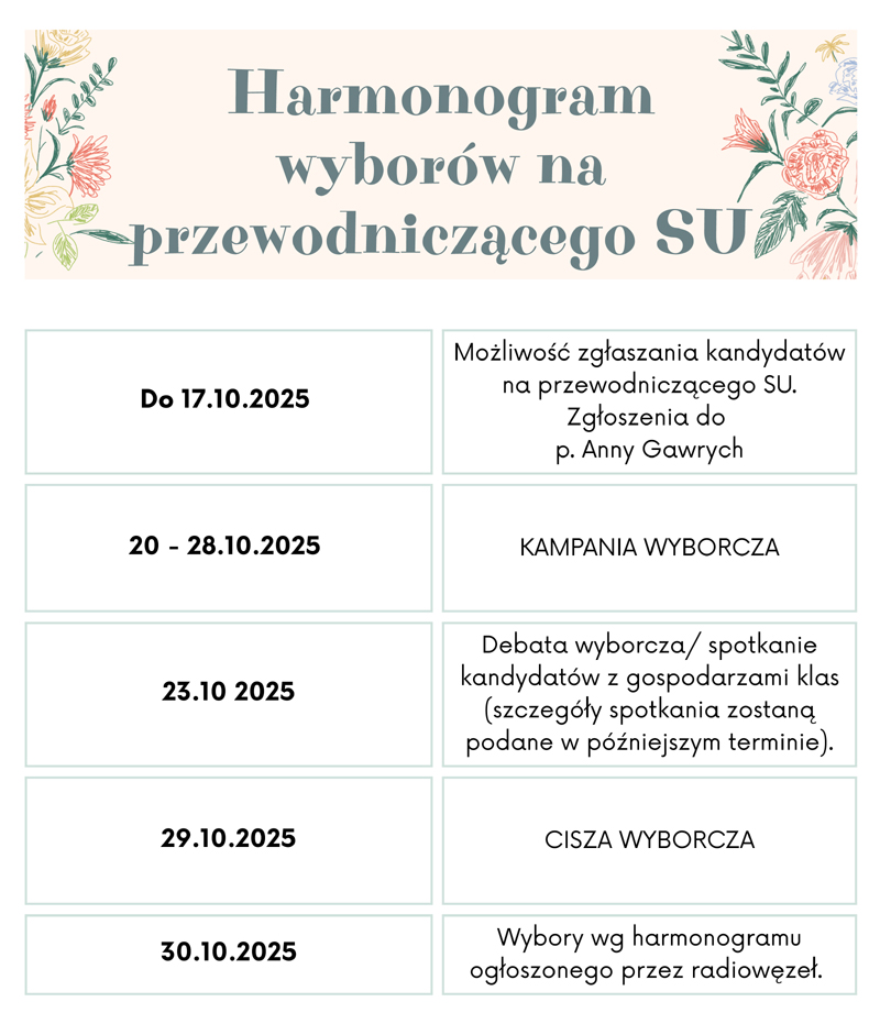do dnia 17 października 2025 roku zapraszamy do zgłaszania kandydatury w ramach wyborów na przewodniczącego Samorządu Uczniowskiego.